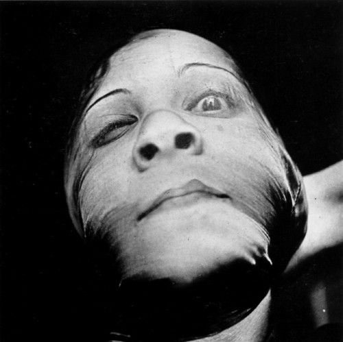 Vera autore della fotografia è invece proprio Leonor Fini che immaginò, si truccò, si infilò una calza in testa (quel che sporge è il braccio cui è attaccata la mano che tiene stretta in pugno la calza), si mise in posa e gli chiese una foto (ricordo che Duchamp utilizzava Man Ray come scimmia scattante, quanto poco rispetto da parte dei pittori per i fotografi!).